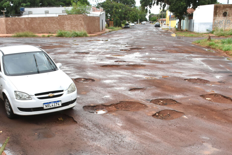 Rua do Boticário, no Bairro Jockey Club, está toda esburacada, o que dificulta a vida dos motoristas que por ali tentam trafegar - Foto: Gerson Oliveira / Correio do EstadoCrateras também foram encontradas na Avenida Europa, na Vila Jaci, e na Avenida Calógeras, assim como na Rua Jornalista Belizário Lima, na Vila Glória, que fica muito próximo do Centro do Campo Grande.