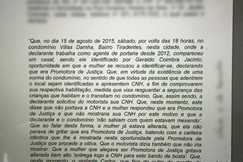 No depoimento prestado ao MPE pela vítima que atua desde 2012 como agente de portaria no condomínio, ela relata que a promotora chegou na portaria com o marido por volta das 18 horas do dia 15 de agosto.