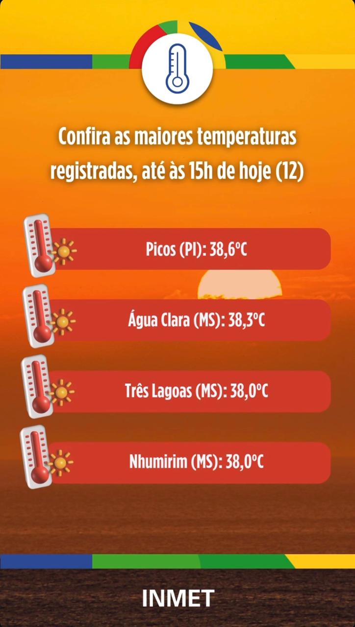 Fonte: Reprodução INMETNa última terça-feira (11), quatro cidades de MS também fizeram parte do Top 10 entre as maiores temperaturas do País: Corumbá (38,2ºC), Porto Murtinho (38,2ºC), Nhumirim (38,1ºC), Coxim (37,8ºC) e Paranaíba (37,2ºC).