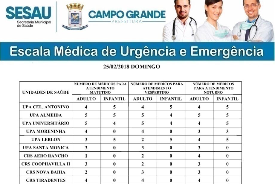 Apenas quatro dos dez postos de saúde 24h tem médicos pediatras no plantão da tarde deste domingo (25) em Campo Grande. De acordo com a escala da Sesau (Secretaria Municipal de Saúde Pública), apenas as UPAs (Unidades de Pronto Atendimento) dos bairros Coronel Antonino, Universitário, Vila Almeida e Leblon estão com efetivo para esse tipo de demanda.