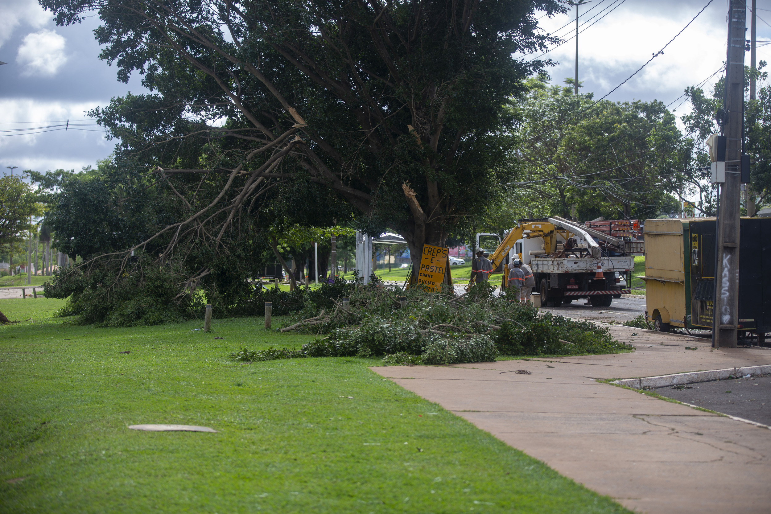 Árvore caída na Avenida Afonso Pena - FOTO: Marcelo VictorCabe ressaltar que, o Parque das Nações Indígenas fica localizado nos Altos da Avenida Afonso Pena, que também teve estragos causados pelo temporal do último domingo (2).