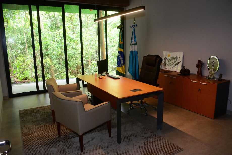 A obra custou R$ 1,3 milhão e conta com sala de reunião com portas de vidro, com vista para a natureza. A reforma conta também com outros escritórios, cozinha e decks.