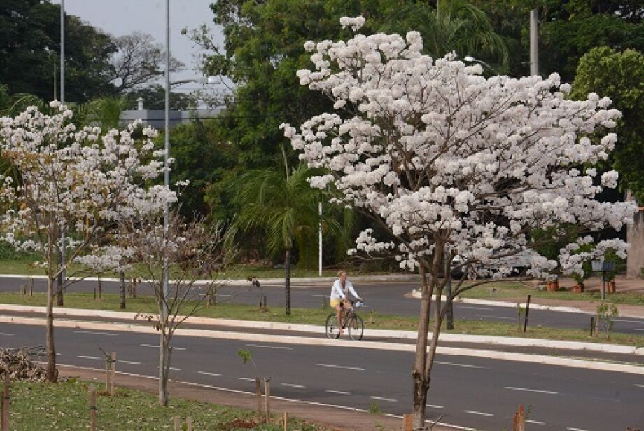Os ipês-brancos plantados no parque linear acompanham o crescimento do bairro e deram sua primeira florada este mês. Um deles, ainda de porte pequeno, fica a poucos metros da casa de Vandone Pael.
