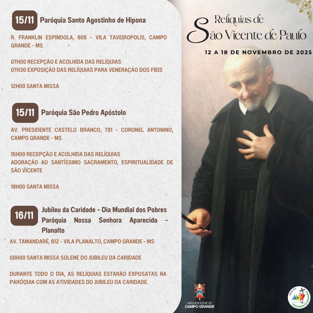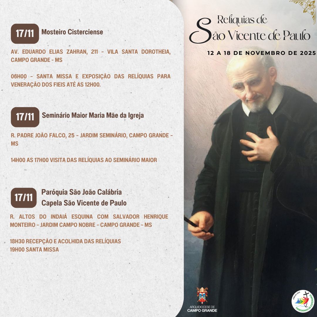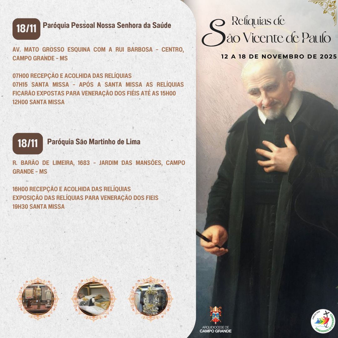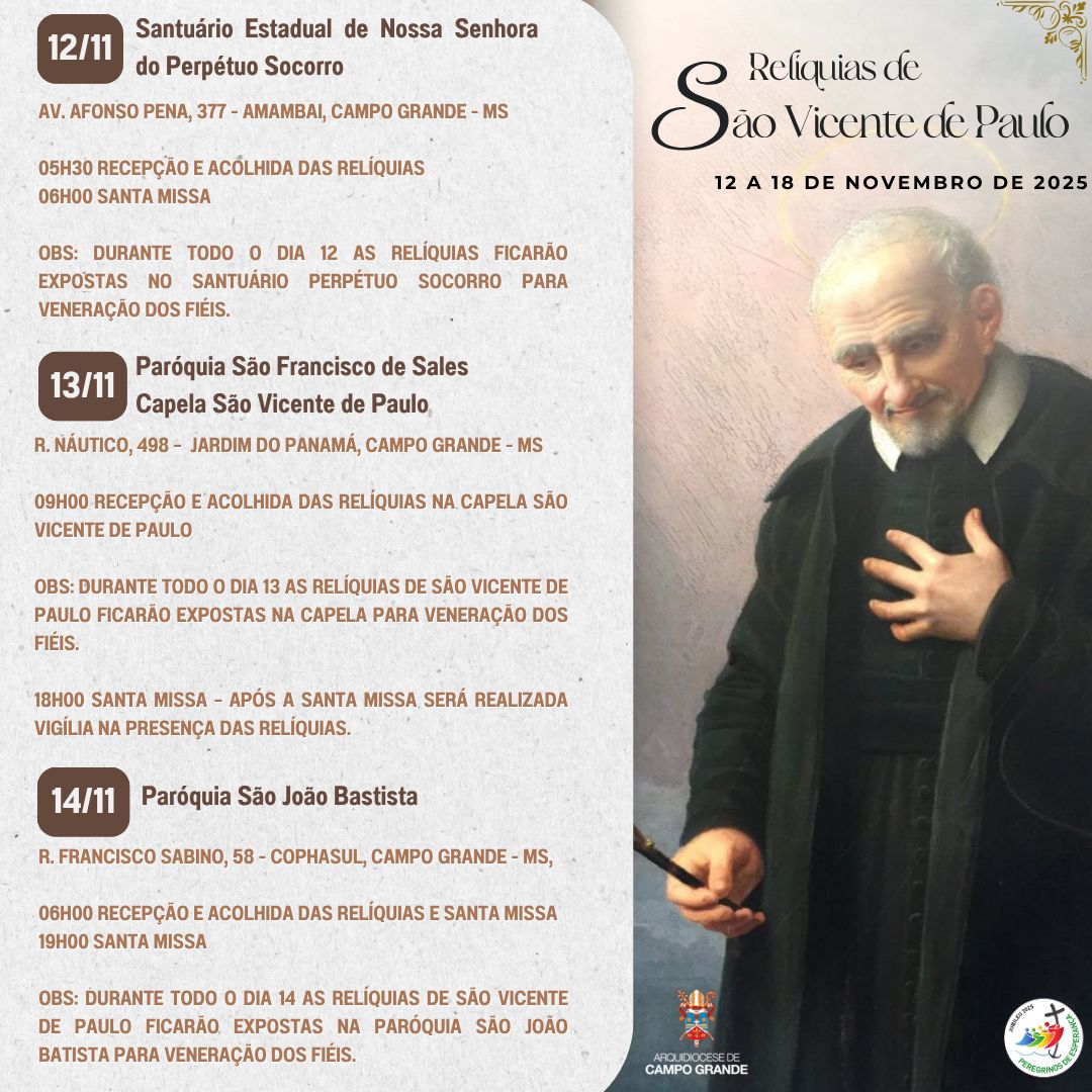 As relíquias de São Vicente de Paulo, sacerdote francês que viveu de 1581 a 1660 e foi canonizado em 16 de junho de 1737 pelo Papa Clemente XII, em Roma, chegaram a Campo Grande nesta quarta-feira (12), onde ficarão expostas até o dia 18 de novembro.