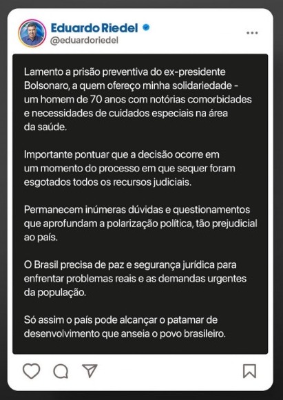 Reprodução/Redes sociaisAgora, Riedel reforçou que, segundo ele, quando houve a prisão, "não tinha nenhum elemento ainda", o que justificou sua manifestação como alguém que entende a necessidade de se esgotar as questões jurídicas.