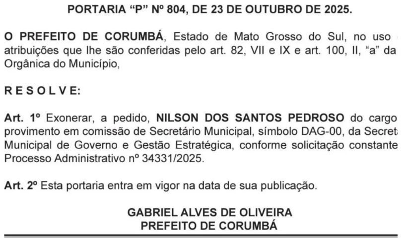 Foi publicada na edição Diário Oficial de Corumbá de quinta-feira (23), a exoneração do secretário municipal de Governo e Gestão Estratégica, Nilson dos Santos Pedroso, preso durante cumprimento da operação Fake Cloud, deflagrada pelo Ministério Público de Mato Grosso do Sul (MPMS), na manhã do mesmo dia do desligamento do cargo.