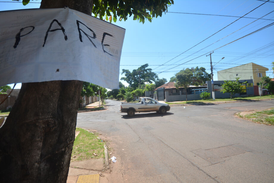 Equipe de reportagem do Correio do Estado flagrou um papel, com a palavra “PARE”, escrita à mão, pendurada em uma árvore de médio porte, que fica na esquina de uma rua movimentada e importante da região, interligando os bairros Taveirópolis, Vila Belo Horizonte, Caiçara e Vila Anhaí.
