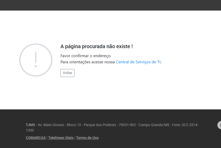 O portal do Tribunal de Justiça de Mato Grosso do Sul (TJMS), para quem tentou acessá-lo durante a tarde desta quarta-feira (7), apresentou a mensagem “A página procurada não existe!”.