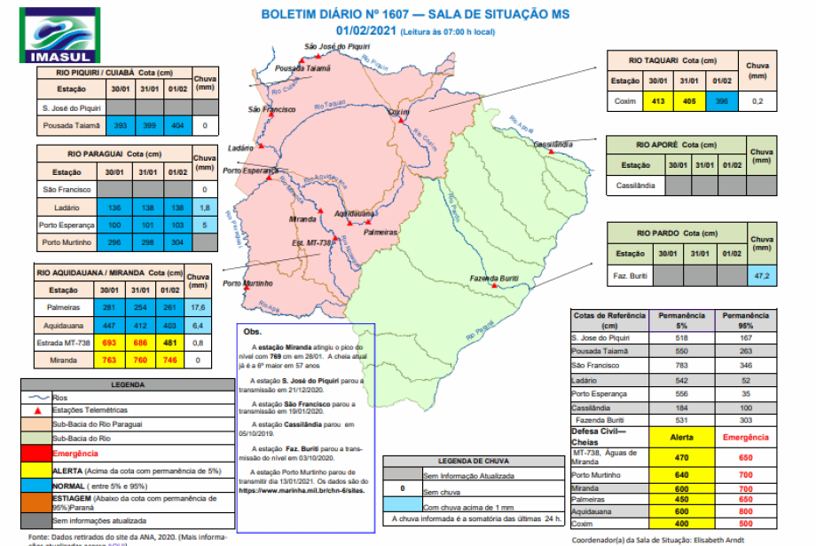 Embora o nível do Rio Miranda tenha diminuído nos últimos dias, a situação nas estações Estrada MT-738 (em Nioaque) e Miranda, ainda é crítica e continua sob alerta.