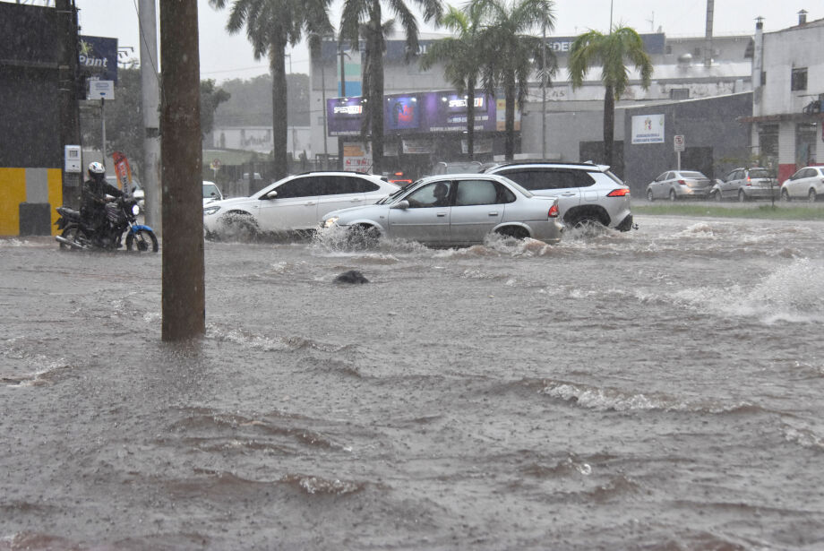 As chuvas que caíram em Campo Grande na tarde desta segunda-feira (13) causaram alagamentos em alguns pontos da cidade. Durante o temporal, os ventos chegaram a quase 50 km/h e mais de 650 raios caíram sobre a Capital.