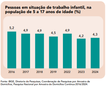 Em 2024, o Brasil registrou 1.650 milhão de crianças e adolescentes com idades entre 5 a 17 anos, em situação de trabalho infantil, ou seja, realizando atividades econômicas ou produção para o próprio consumo, com critérios de jornada, escolarização, informalidade, tipo de atividade prejudicial, etc.