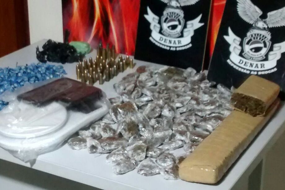 Com Douglas, os policiais apreenderam 563 porções de pasta base de cocaína, trouxinhas e dois tabletes de maconha, além de um celular e uma motocicleta XRE 300. Na casa da mãe do suspeito, os agentes encontraram 37 munições calibre 9mm de uso restrito e nove munições calibre 38.