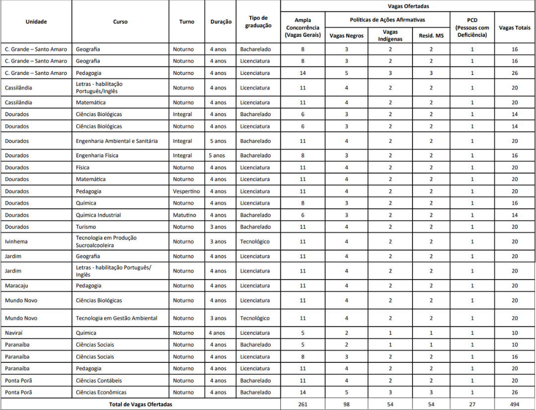 As vagas são divididas em ampla concorrência e cotas (20% para negros, 10% para indígenas, 10% para residentes em MS e 5% para PCD). Os candidatos concorrerão ao mesmo sistema de concorrência indicado no ato de inscrição.