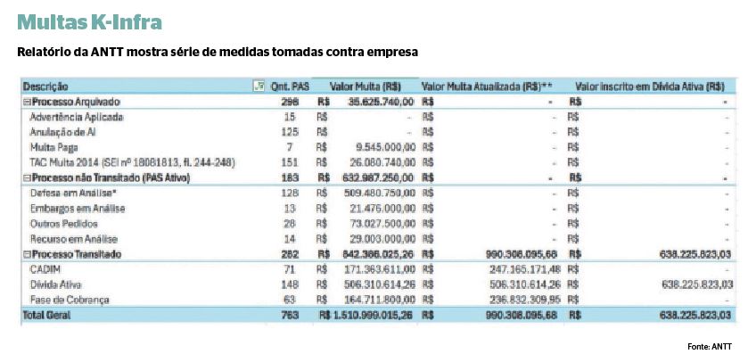 O abandono dos 182,5 km da BR-393, no Rio de Janeiro, que tem pontos com asfalto esfarelando e com buracos, e o desrespeito constante ao contrato de concessão fizeram com que a K-Infra tenha, hoje, R$ 1,5 bilhão em multas. Esses procedimentos influenciaram na caducidade do acordo, que ocorreu na quarta-feira e acabou suspendendo o andamento do leilão da Rota da Celulose, do qual a empresa foi vencedora.