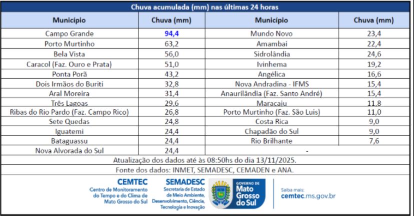 No oeste da cidade, na região do Aeroporto Internacional de Campo Grande, foram registrados 68 milímetros. A média histórica de chuvas para novembro em Campo Grande é da ordem de 170 milímetros e até agora, na região da Avenida Guaicurus, foram em torno de 117 milímetros.