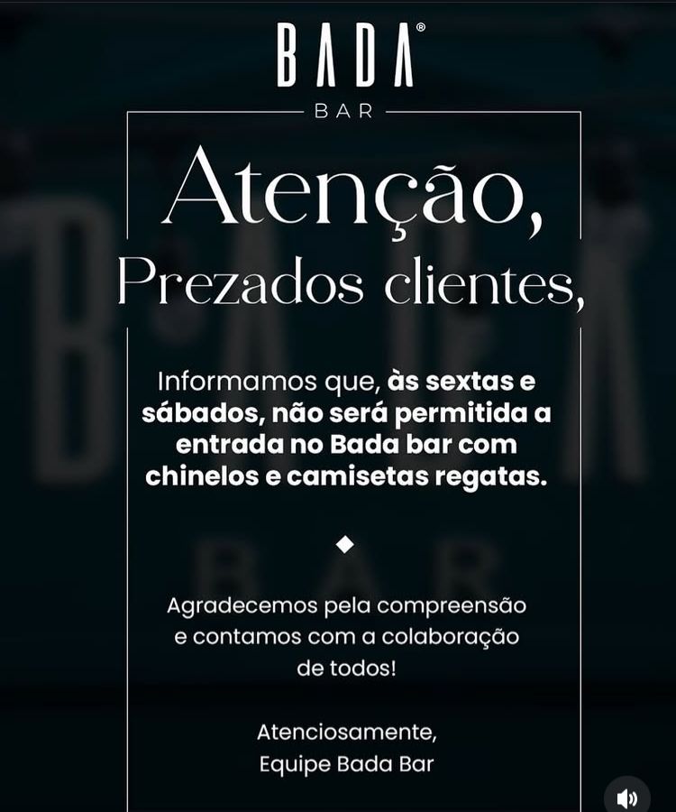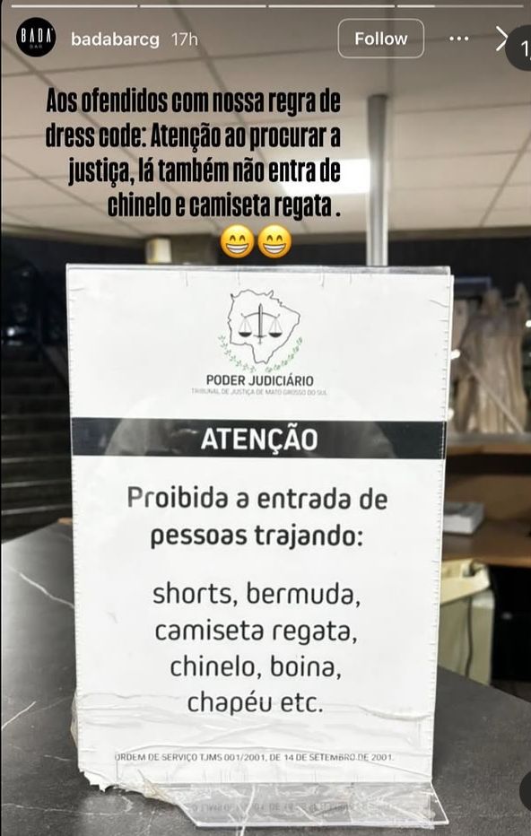 A imagem que foi publicada nos stories temporariamente e sumiu após 24 horas, veio acompanhada dos seguintes dizeres: "Aos ofendidos com nossa regra de dress code: Atenção ao procurar a justiça, lá também não entra de chinelo e camiseta regata", escreveu na publicação. Veja abaixo: