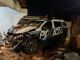 A parte frontal da viatura ficou completamente destruída e amassada. Diversos tijolos foram parar na lataria e vidros do veículo.