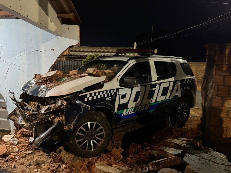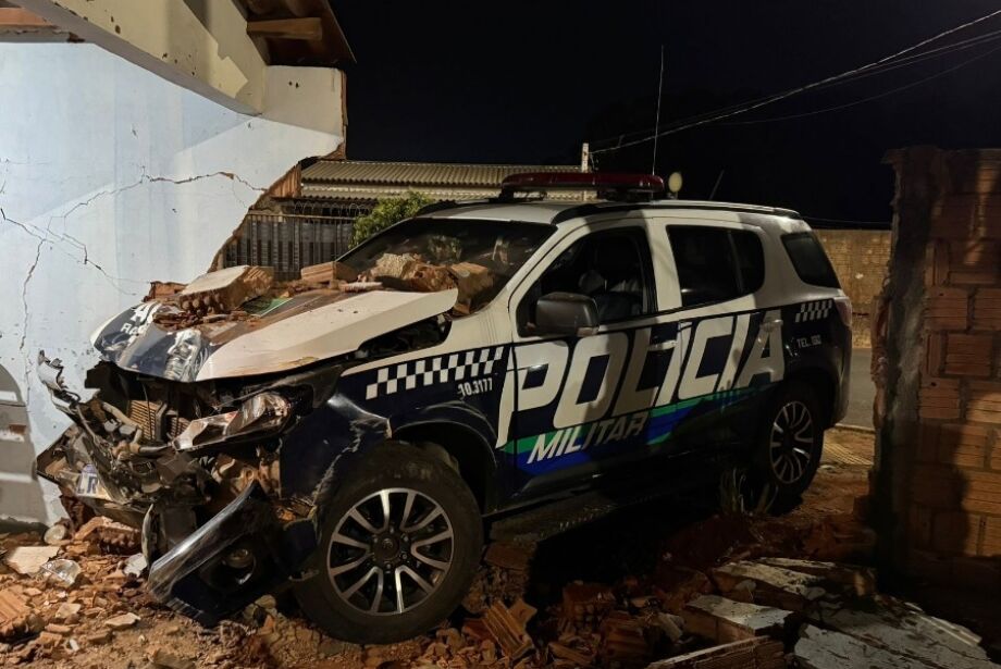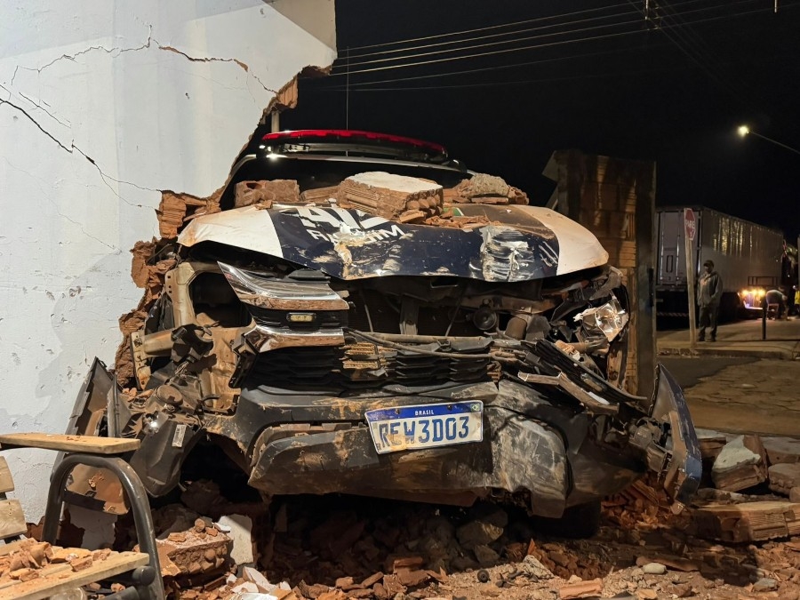 Viatura da Polícia Militar ficou destruída após perseguir uma moto e colidir contra o muro de uma residência, na noite desta quarta-feira (2), na esquina das ruas Santo Antônio e José Monteiro Magalhães, bairro Ulisses Pinheiro, em Nova Andradina, município localizado a 298 quilômetros de Campo Grande.