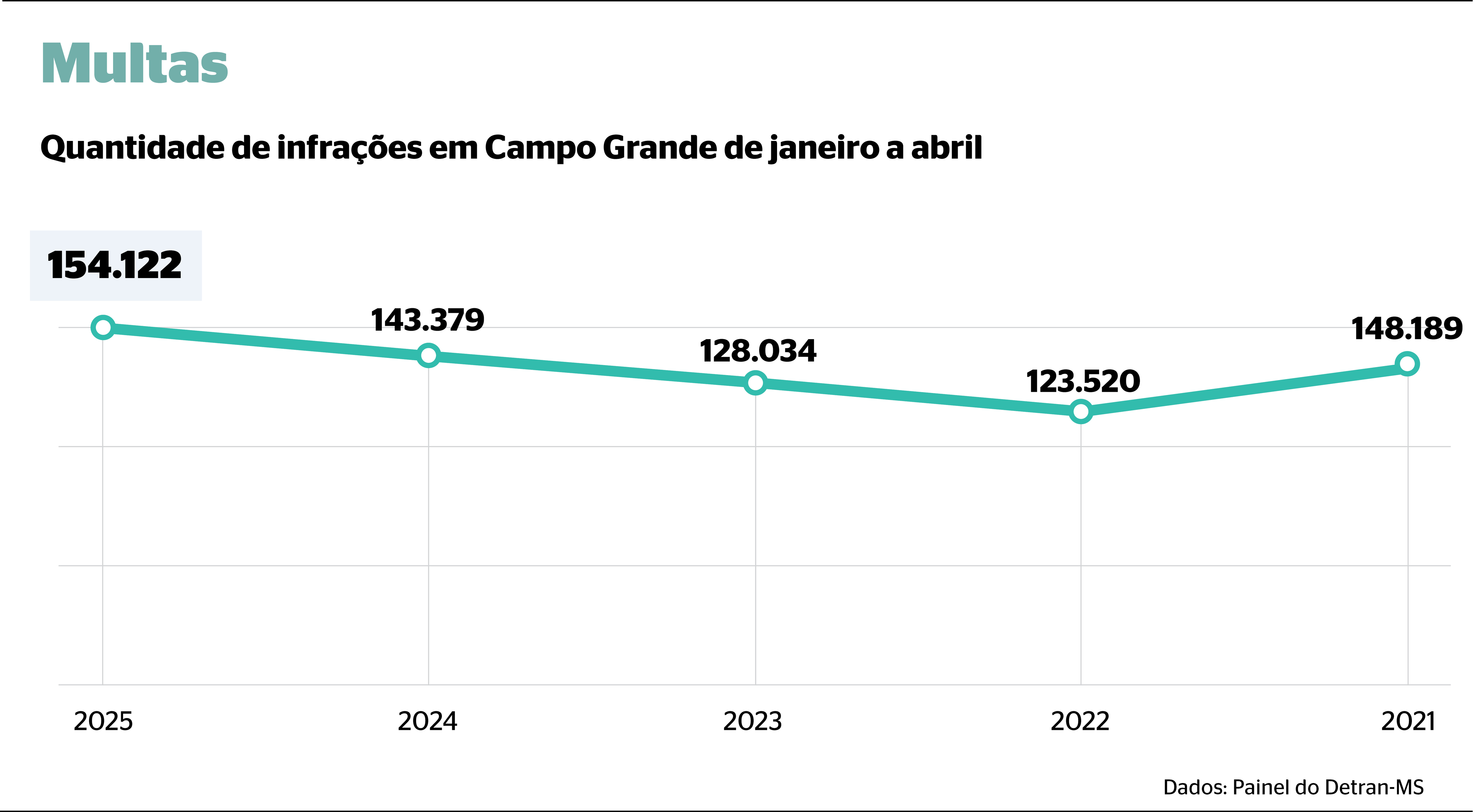 Nos últimos cinco anos, foram registrados em Mato Grosso do Sul 2,9 milhões de infrações. Entre as classificações de gravidade, as infrações médias foram as mais aplicadas (32%), já as gravíssimas corresponderam a 20% do total de multas.