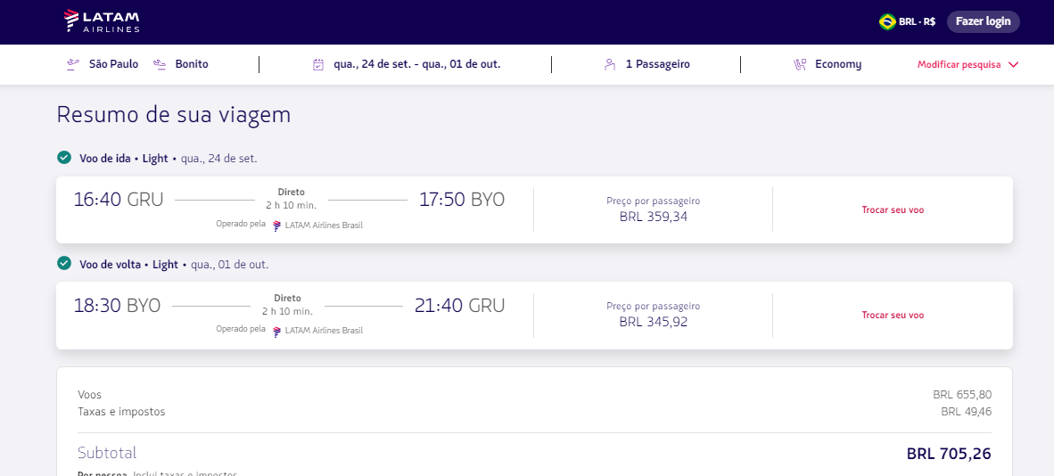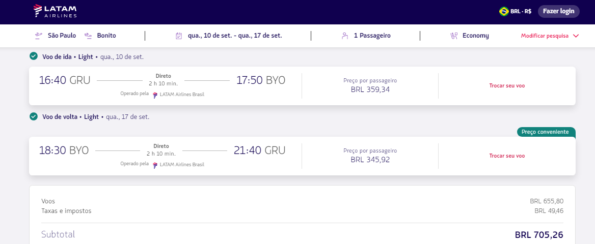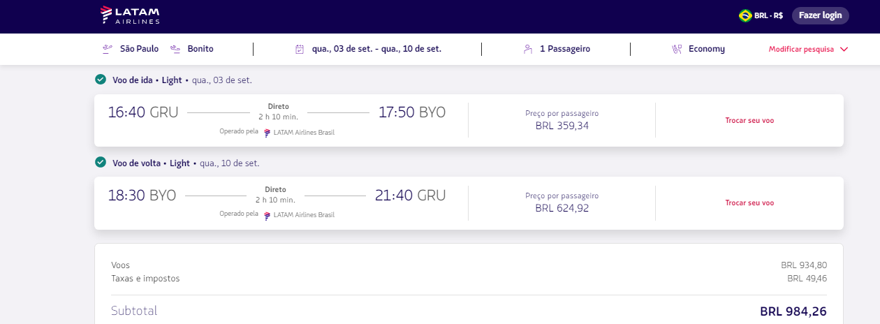 O voo tem duração de 2 horas e 10 minutos. O voo sai de Guarulhos às 16h40 e chega em Bonito às 17h50. Na volta, sai de Bonito às 18h30 e chega às 21h40min em Guarulhos.
