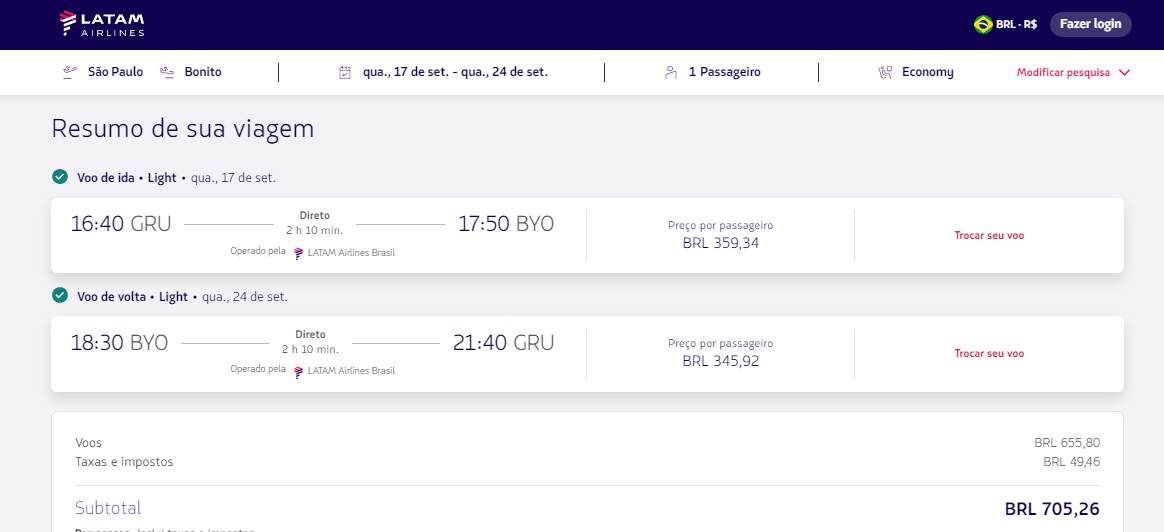 Pesquisa realizada pelo Correio do Estado, no site da Latam, na manhã desta quarta-feira (25), mostra que o valor da passagem aérea varia de R$ 705,26 a R$ 984,26 no mês de setembro de 2025.