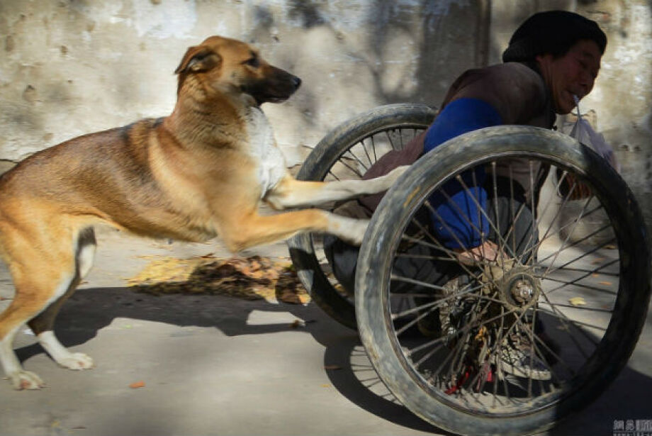 Bo Laoma, um sapateiro que possui paralisia nas pernas, foi visto sendo empurrado por seu cão de estimação até o local onde trabalha. O homem usa a cadeira de rodas improvisada para se locomover.