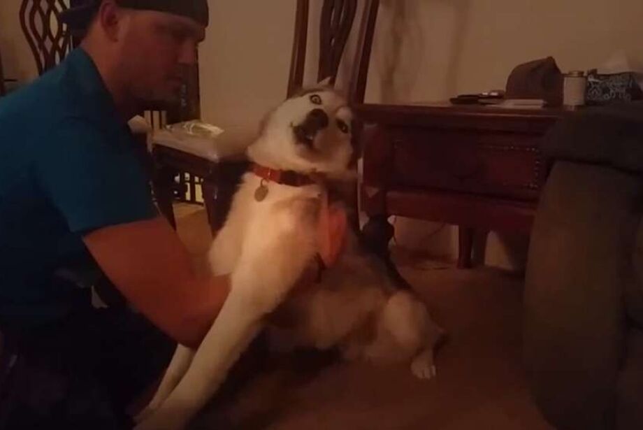 No vídeo que circula pela internet, um husky siberiano perde a capacidade de ficar em pé