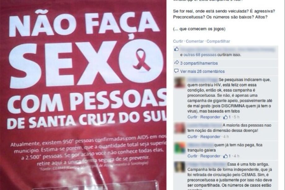 Um cartaz de uma campanha contra a Aids teve grande repercussão em Santa Cruz do Sul, no Vale do Rio Pardo, Rio Grande do Sul. Com letras garrafais em um fundo vermelho, o anúncio pede que ninguém tenha relações sexuais com outros moradores da cidade.