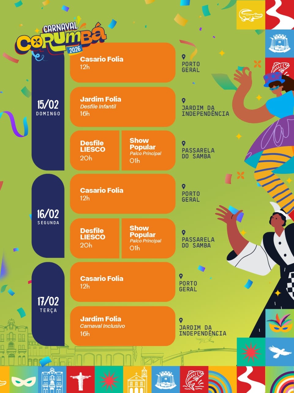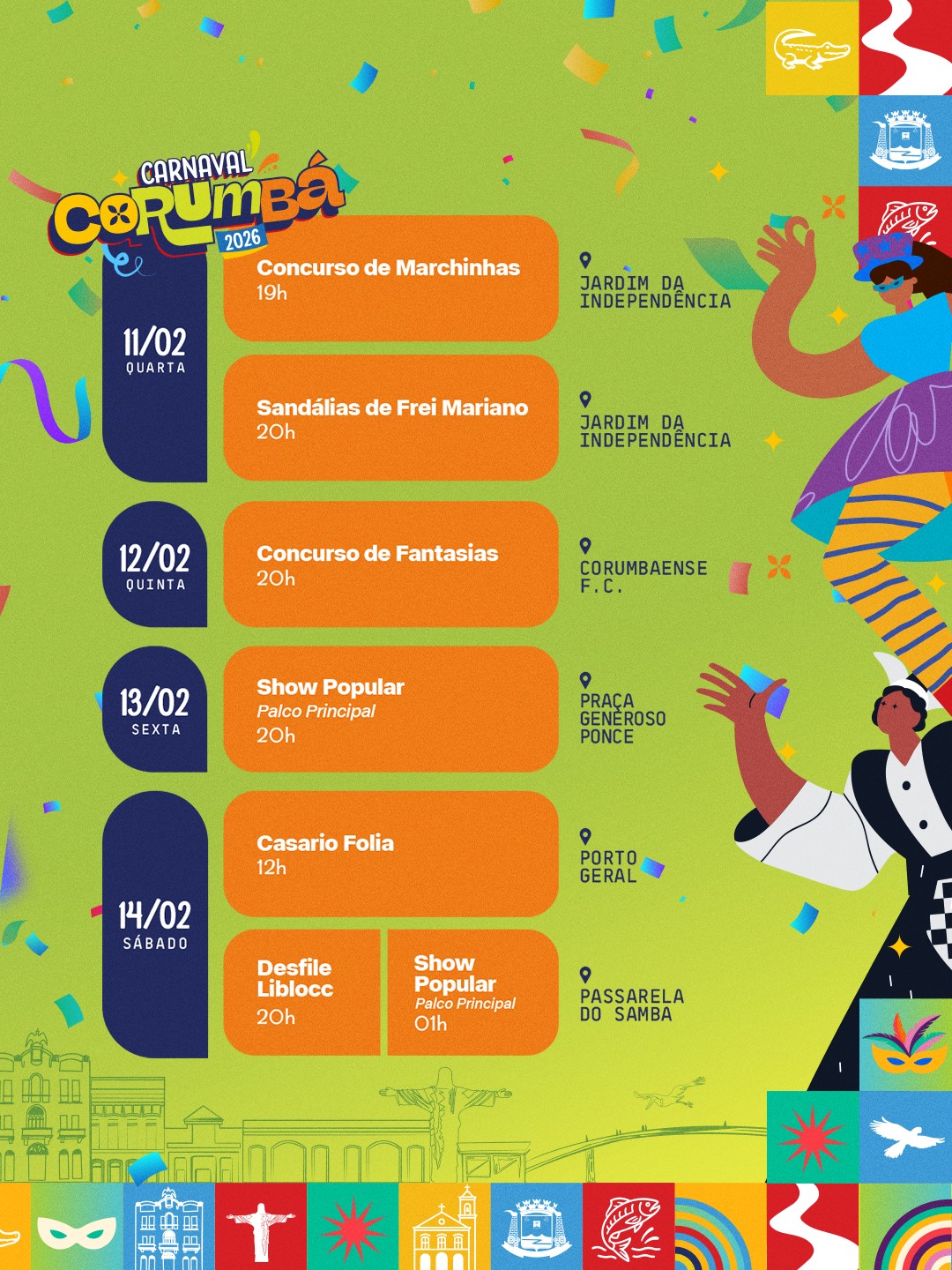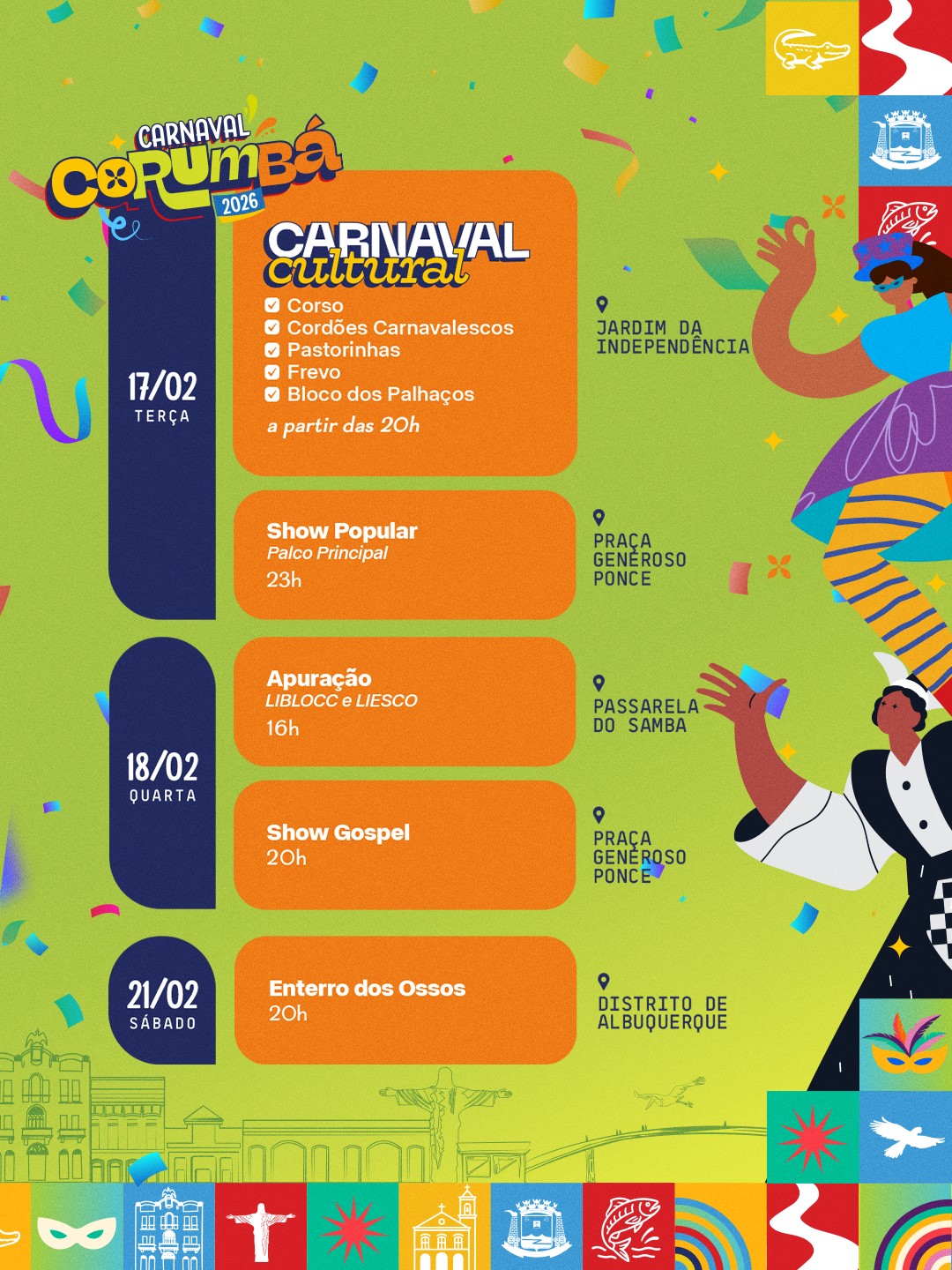O Carnaval de Corumbá foi lançado às 18 horas desta sexta-feira (23), no Jardim da Independência, na Capital do Pantanal. Durante o evento, foi apresentada a programação oficial para o ano de 2026. Confira: