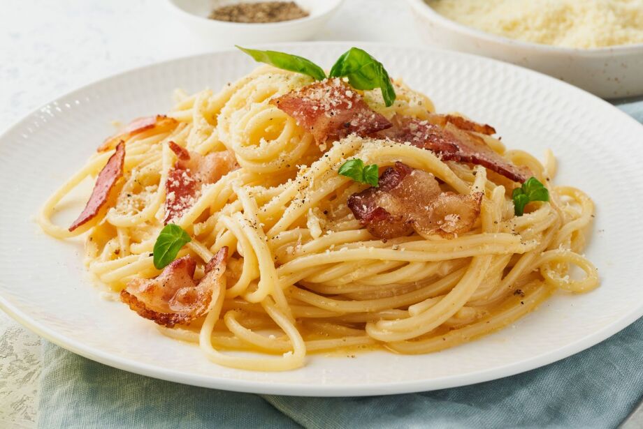 A tradicional versão leva apenas alguns ingredientes. A água do cozimento – muitas vezes esquecida na hora do preparo – é que vai dar o ponto correto para o molho cremoso, que todo carbonara deve ter. Um pouco de bacon desfiado por cima do macarrão vai bem para a finalização do prato ou então uns chips de parmesão.