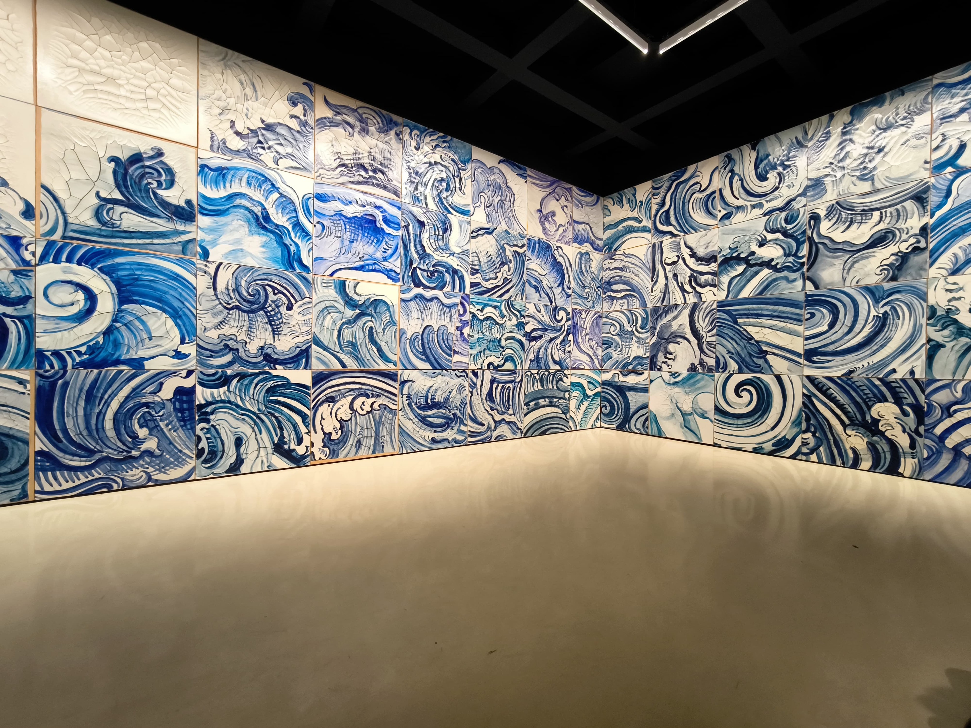 A artista plástica brasileira traz os azulejões barrocos portugueses montados de forma desordenada, dando a aparência de uma grande onda (“Celacanto provoca maremoto”), além da complexa “Linda do Rosário”, que marca em sua superfície a referência de azulejos comuns, mas com vísceras entranhadas.
