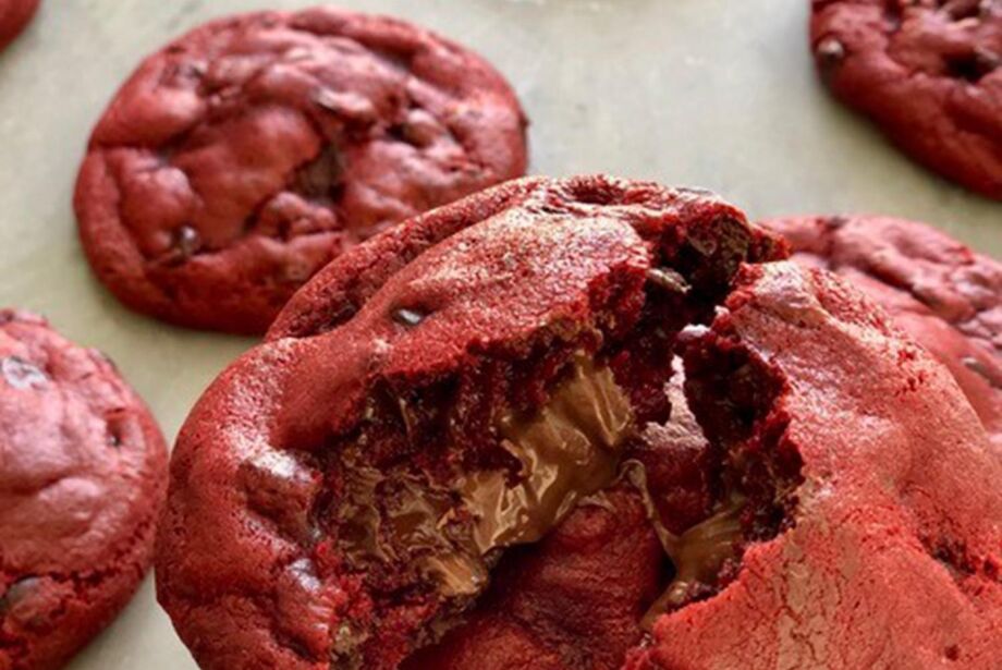 O bolo Red Velvet, ou Veludo Vermelho, ganhou versão cookie nas mãos do confeiteiro Rodolfo Goloso. Na receita do paulistano que mora em Boston nos EUA, em vez do recheio branco, ele usou chocolate e nutella.
