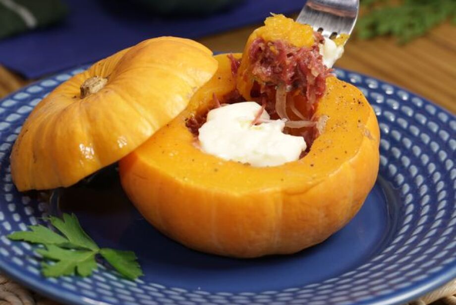 5-Preencha a abóbora com o recheio, coloque 1 colher de requeijão por cima sem mexer, feche com o próprio tampo da abóbora e enrole com o papel alumínio bem selado
