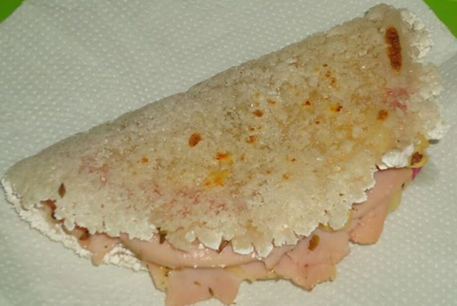 Quando a tapioca estiver pronta, retire da frigideira e coloque duas fatias de goiabada e duas fatias de queijo