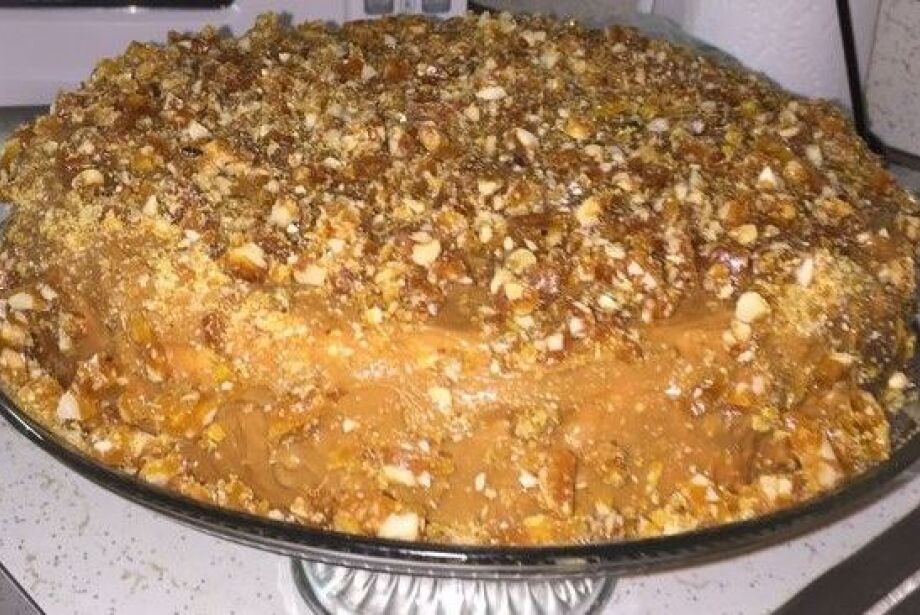 Desenforme em uma bandeja redonda, cubra com doce de leite e, por cima, coloque o crocante.