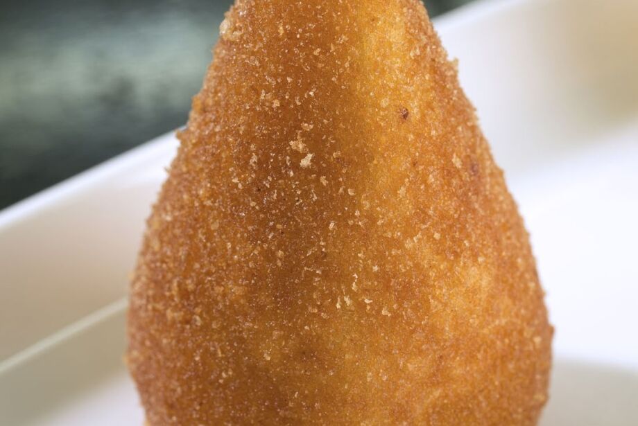 Abrir um pouco da massa, colocar o recheio, e moldar em formato de coxinha.