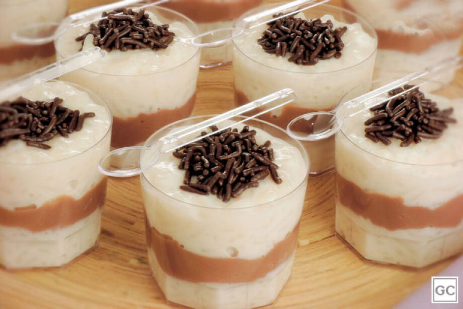 O arroz-doce com chocolate no copinho fica lindo para ser servido em festas convencionais ou juninas. O creme de chocolate deixa a receita ainda mais gostosa e o granulado em cima dá um ar mais sofisticado ao prato.