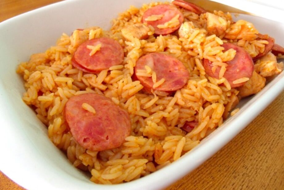 Na panela de pressão frite no óleo, o peito de frango em cubos, a linguiça em rodelas.