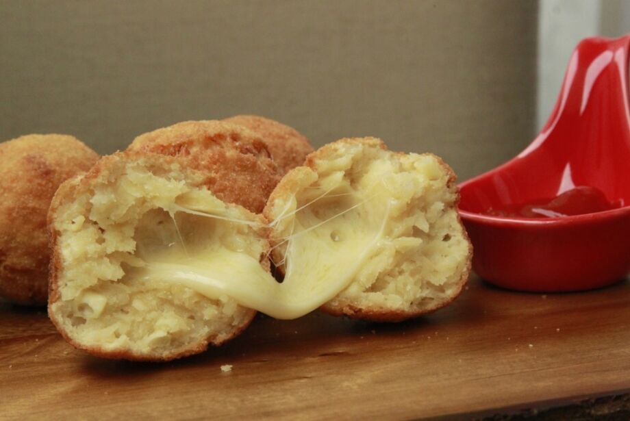 Unte as mãos com óleo e abra a um pouco da massa na palma das mãos, recheie com um cubinho de queijo mussarela e faça bolinhas;