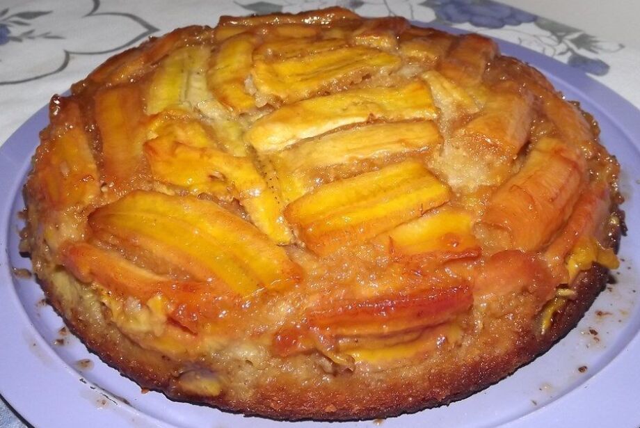 - Sem untar a forma coloque a calda, corte as 4 bananas restante em rodelinhas e coloque sobre a calda, agora é só colocar a massa do bolo