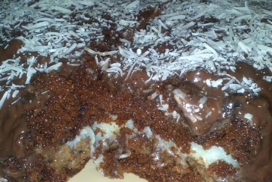 Recheie com o creme de coco, monte o novamente e cubra com a cobertura de chocolate