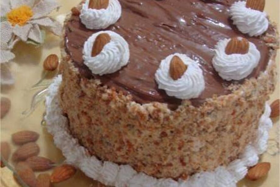 Desenforme e cubra as laterais com creme trufado ou chantilly decorando com o crocante a gosto