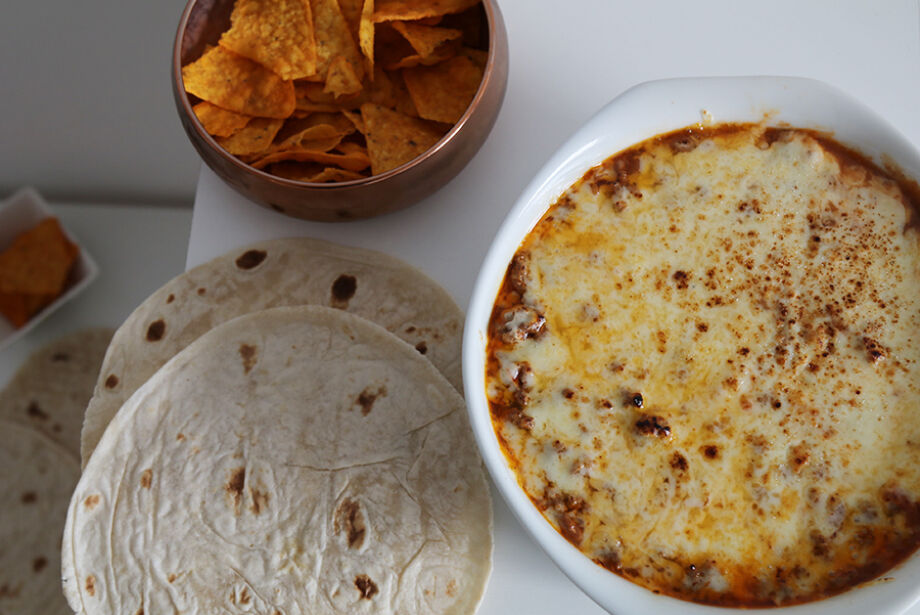 Coloque o chilli em um recipiente e finalize com queijo mussarela.