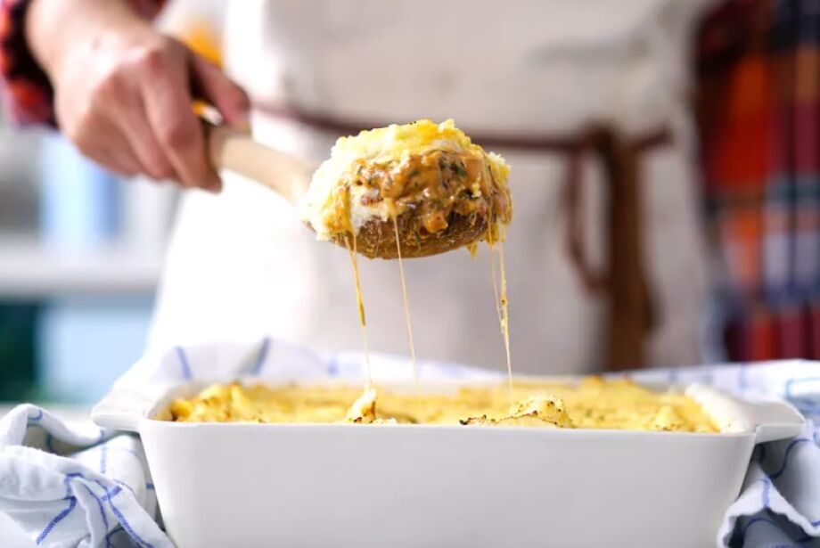 Dispor o camarão em uma forma refratária, dispor o queijo muçarela e cobrir com o purê de batatas por cima e com queijo parmesão.