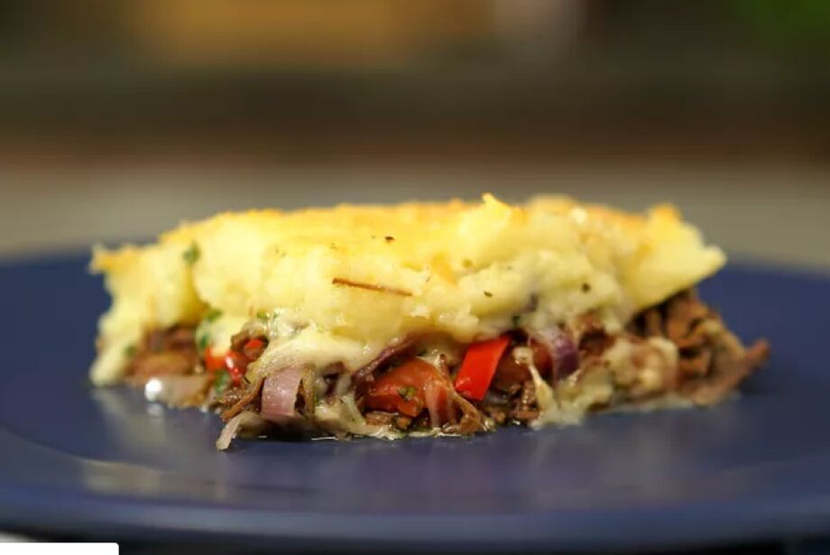 Cobrir com o purê de batatas e finalizar com o queijo parmesão ralado.