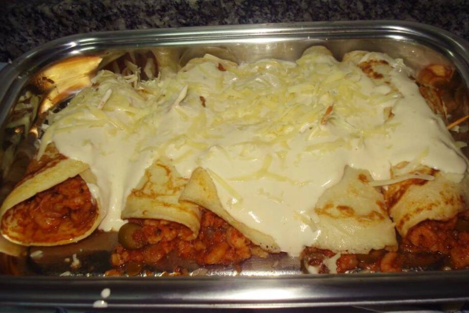 Coloque camadas das panquecas e o molho de camarão e salpique queijo ralado. Faça isto até terminar as camadas. Por último, o molho queijo ralado e leve ao forno para gratinar até ficar bem quente sirva com arroz branco e salada