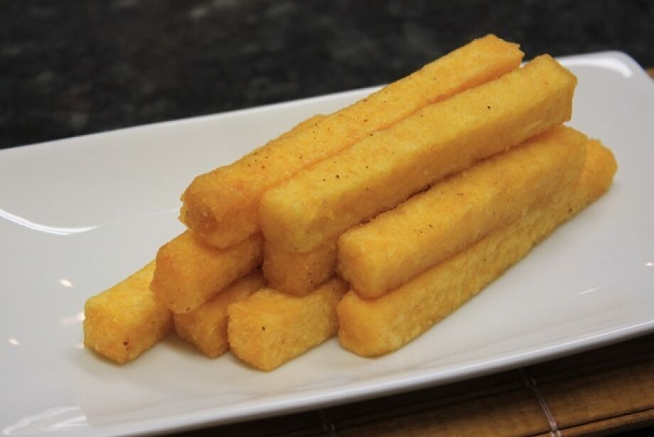 Despeje em uma travessa e deixe esfriar, corte em pedaços, passe no fubá (com os pedaços ainda mornos) e frite em óleo bem quente