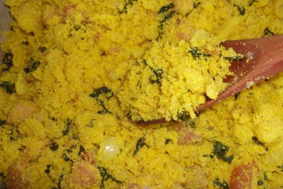 Vá acrescentando a farinha de mandioca mexendo sempre, deixando que fique bem umedecida.