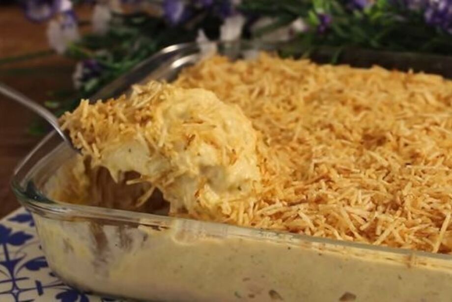 3-Coloque o refogado numa assadeira, cubra com mussarela e espalhe a batata palha por cima