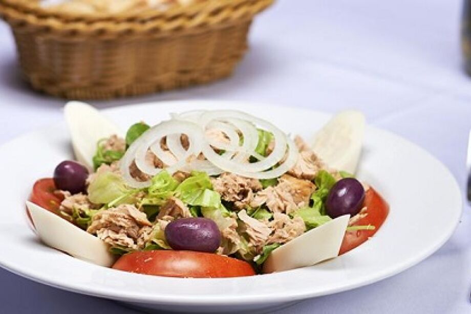 2 - Disponha as folhas misturadas em cima, depois o atum e a cebola. Por último, acrescente as azeitonas.